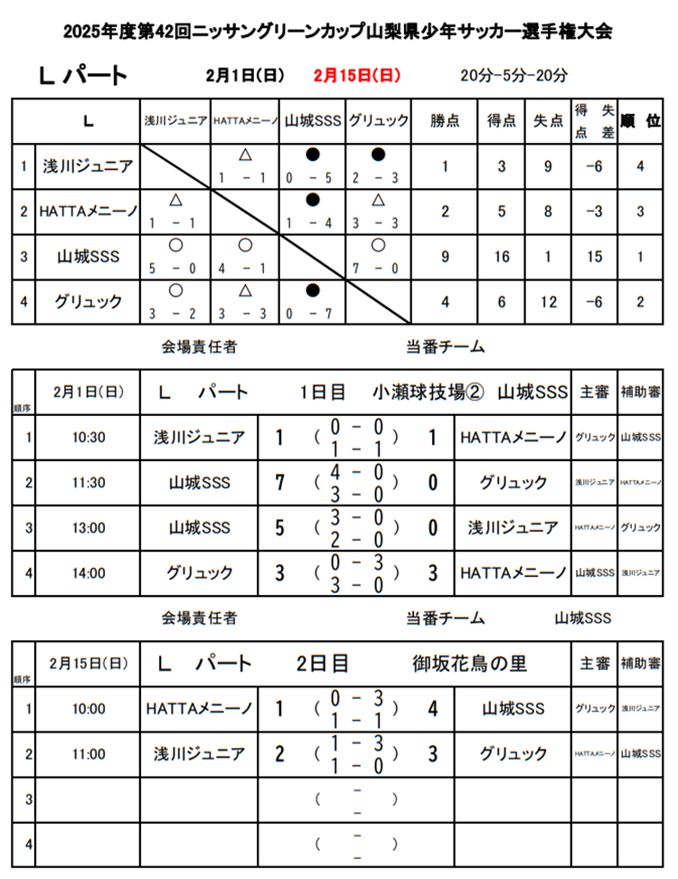 1位:山城SSS、2位:グリュック、3位:HATTA SCメニーノ、4位:浅川ジュニアSSS
