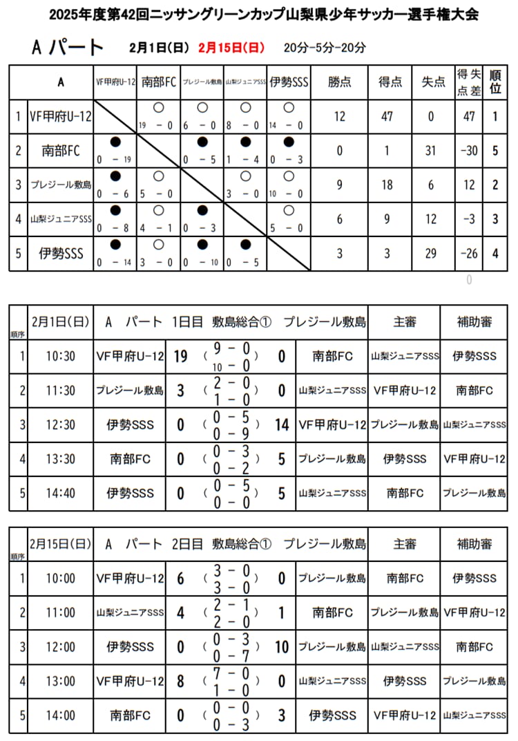 1位:VF甲府U12、2位:プレジール敷島、3位:山梨ジュニアSSS、4位:伊勢SSS、5位:南部FC
