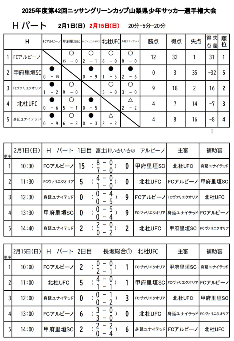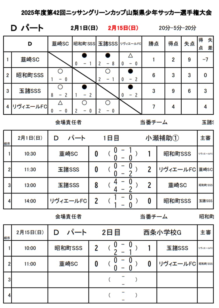 2/8開催予定分は積雪により中止、予選リーグ2日目は2/15に開催予定 参照:山梨県4種委員会サッカーサポートブログ