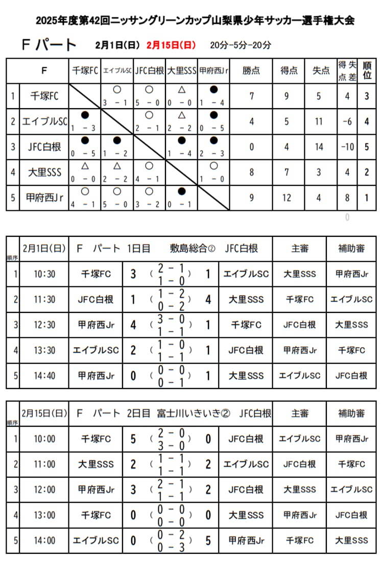 1位:甲府西Jr、2位:大里SSS、3位:千塚FC、4位:エイブルSC、5位:JFC白根