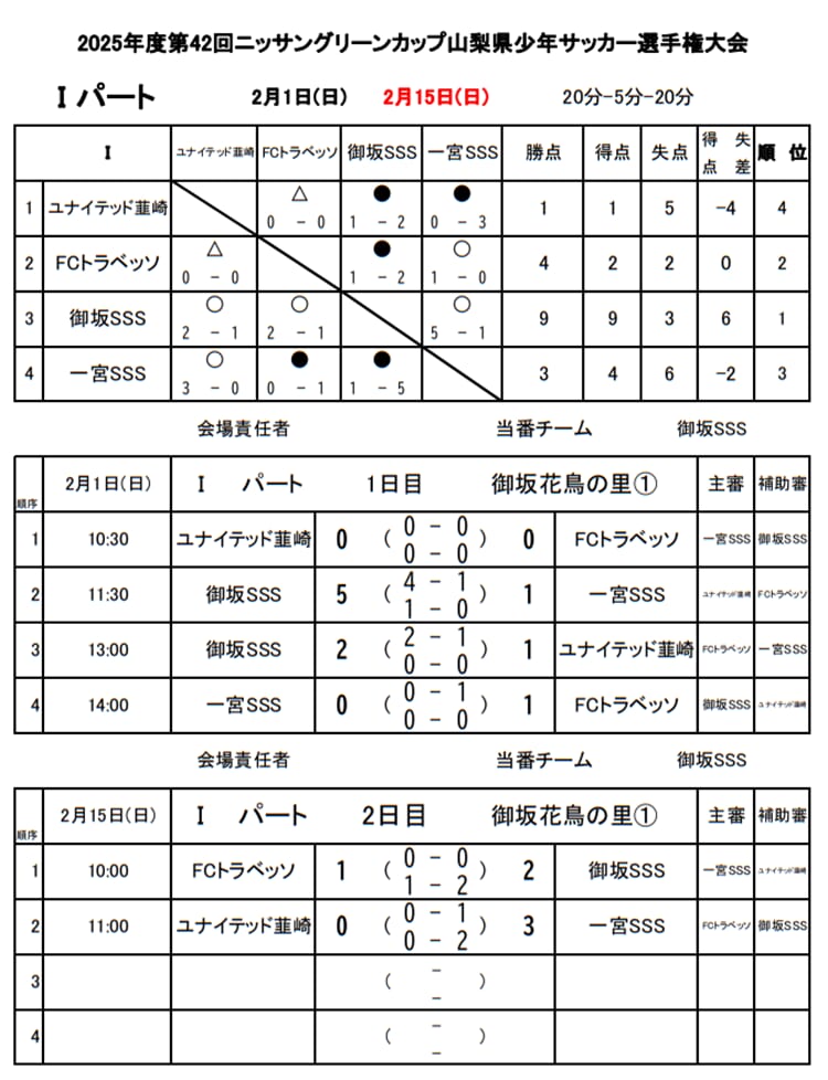 1位:御坂SSS、2位:FCトラベッソ、3位:一宮SSS、4位:ユナイテッド韮崎FC