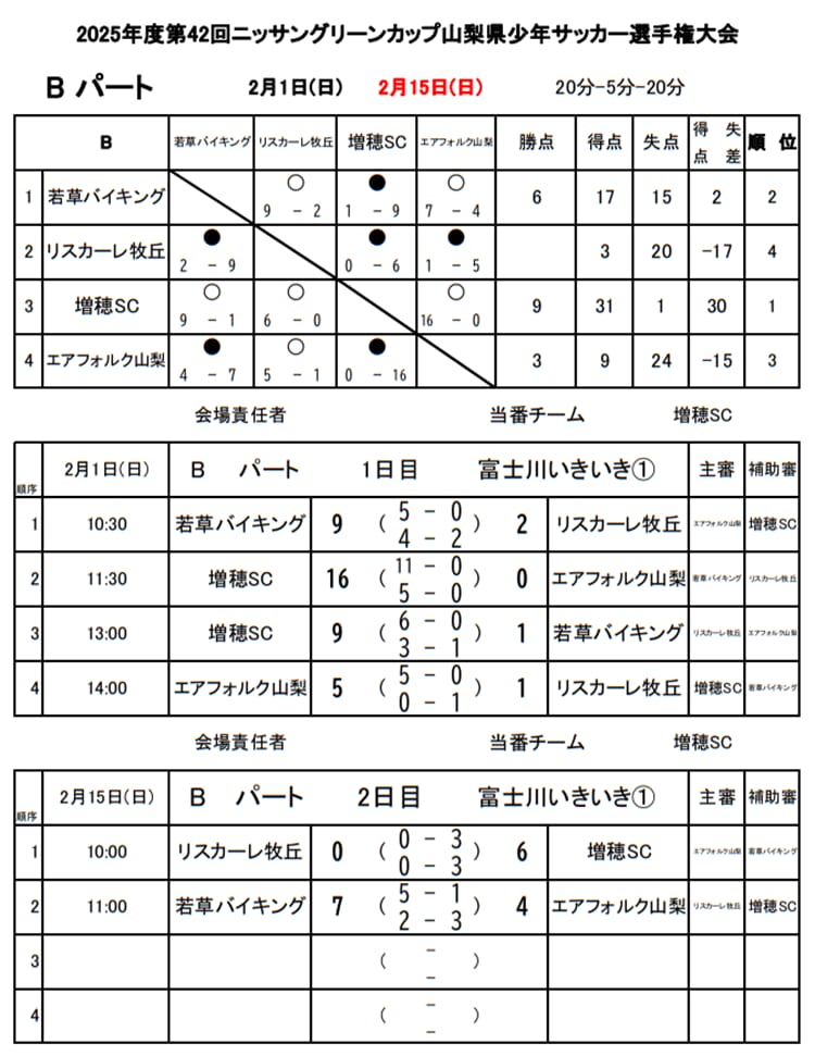1位:増穂SC、2位:若草バイキング、3位:エアフォルク山梨、4位:リスカーレ牧丘