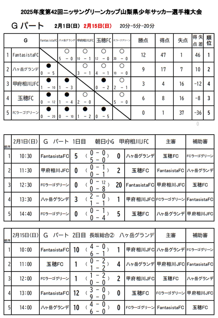 1位:Fantasista FC、2位:八ヶ岳グランデFC、3位:玉穂FC、4位:甲府相川JFC、5位:FCラーゴ・グリーン