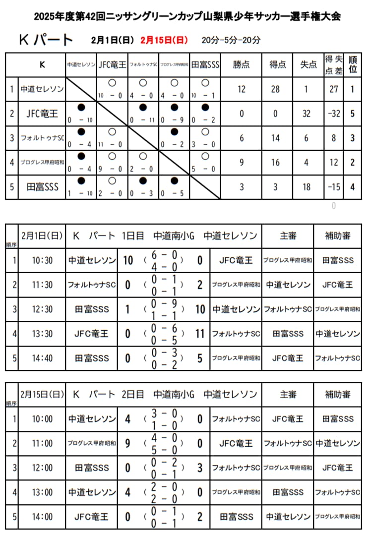 1位:中道セレソン、2位:プログレス甲府昭和、3位:フォルトゥナSC、4位:田富SSS、5位:JFC竜王