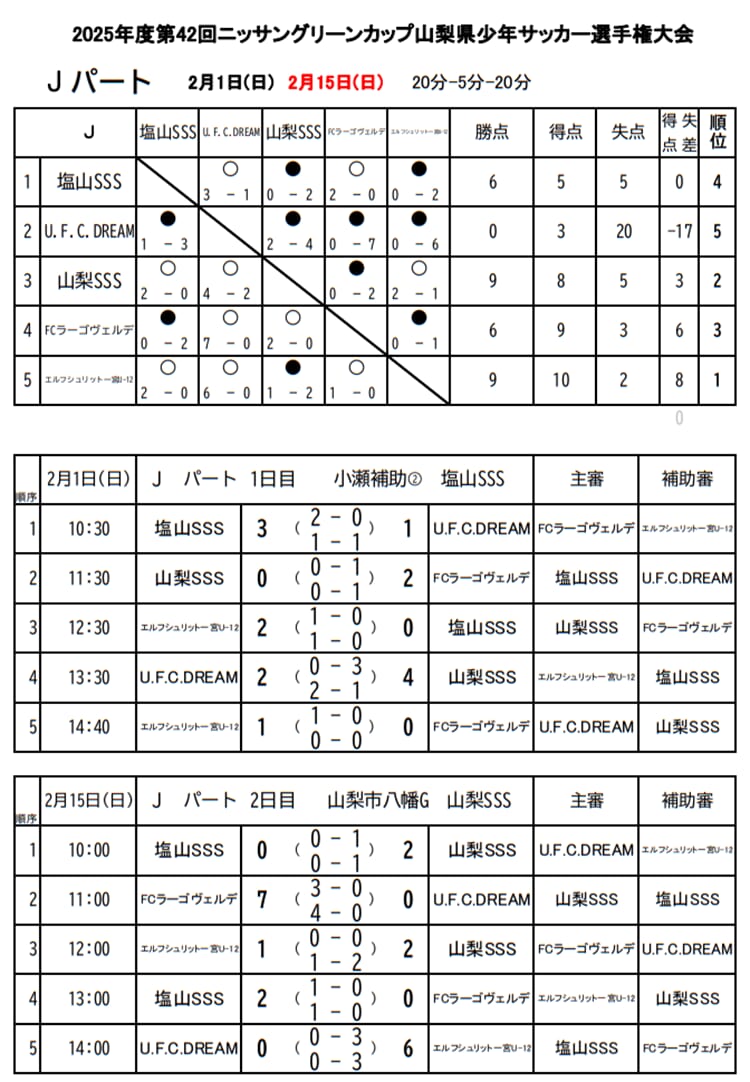 1位:エルフシュリット一宮U12、2位:山梨SSS、3位:FCラーゴ・ヴェルデ、4位:塩山SSS、5位:U.F.C.DREAM