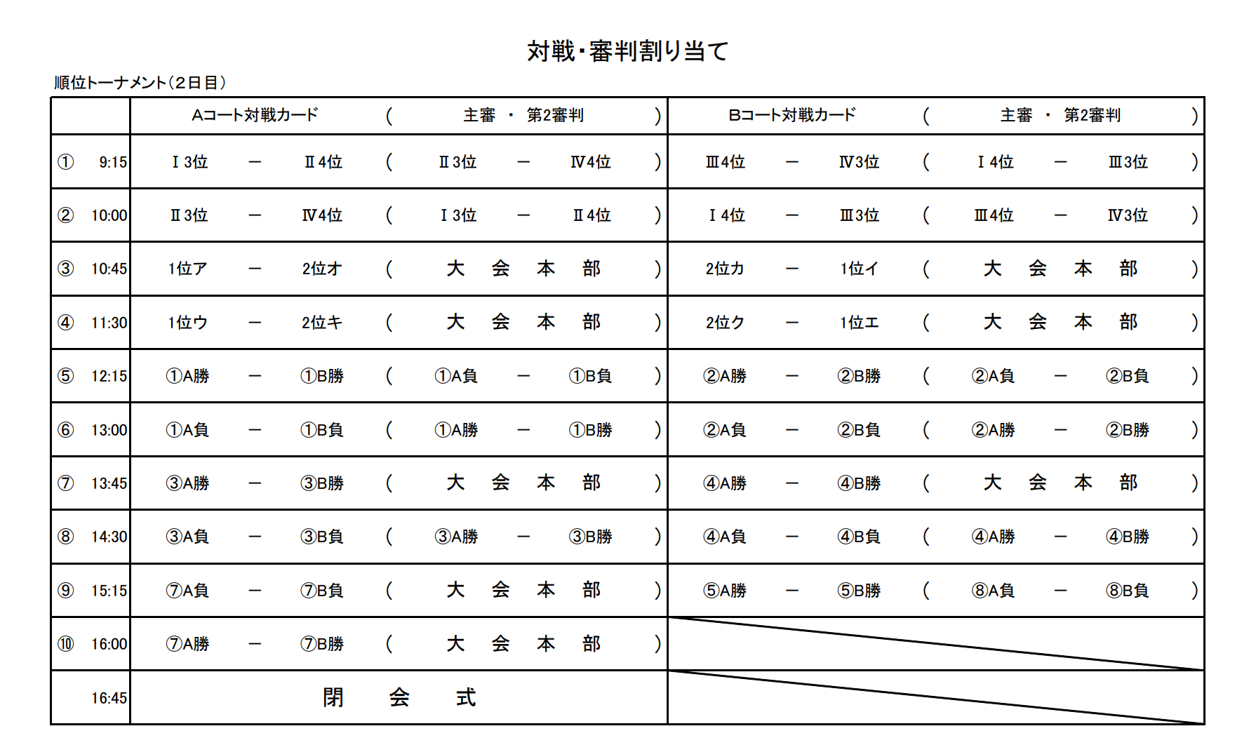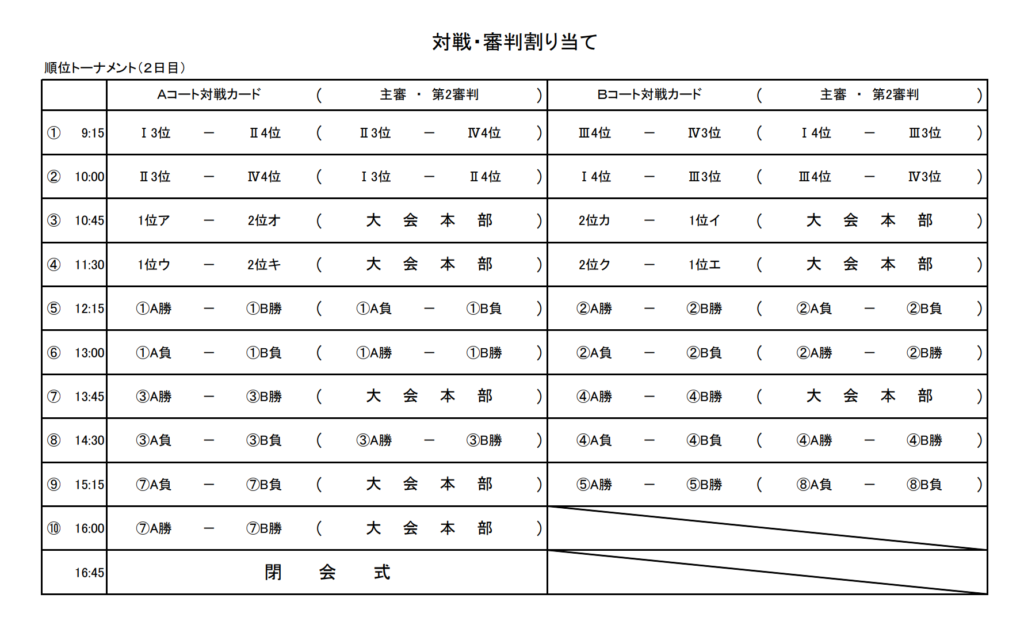 ・1日目終了時に、各1~2位の8チームで抽選を行い、決勝トーナメントの組み合わせを決定する。