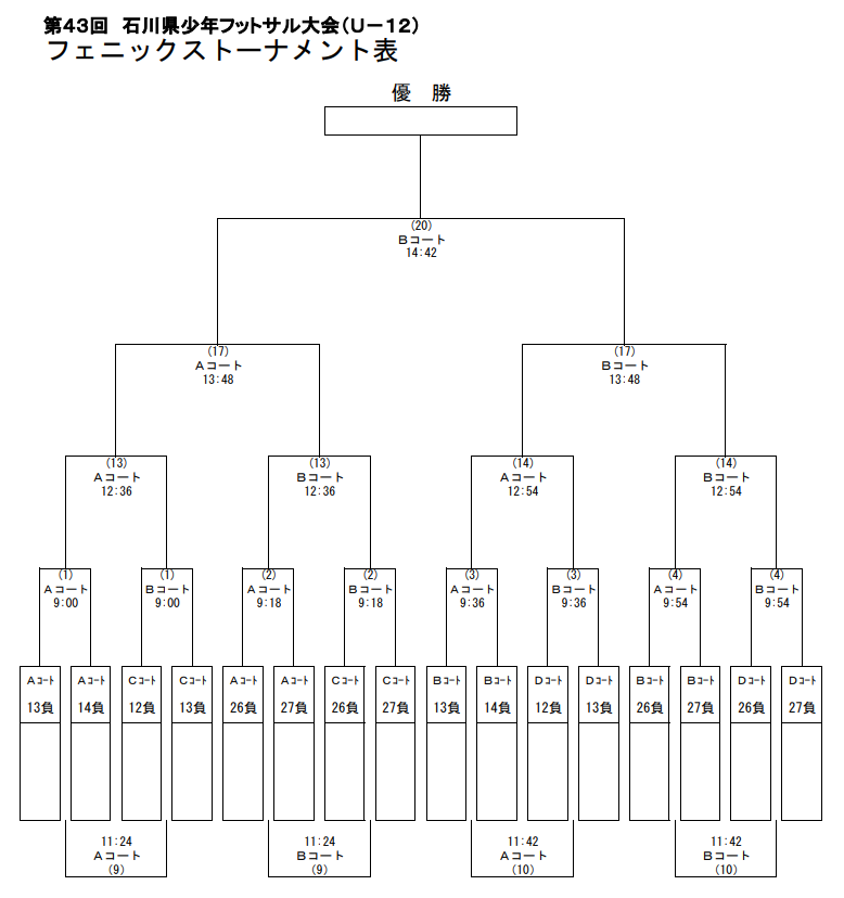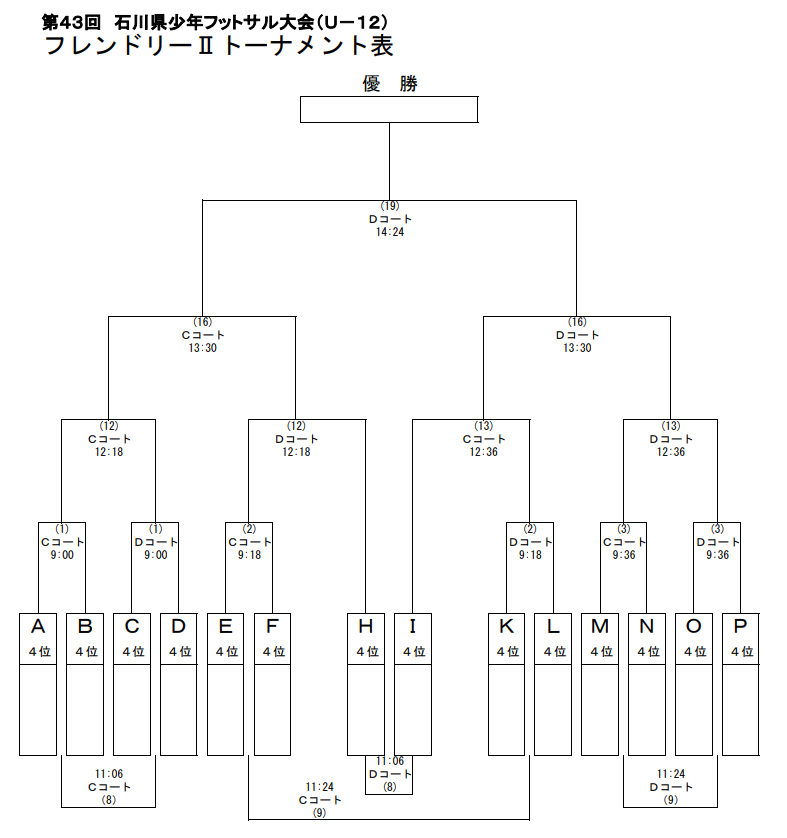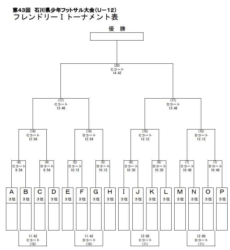 ・予選リーグ及び決勝トーナメント1回戦は12分間(前後半6分ハーフ)、決勝トーナメント2回戦からは14分間(前後半7分ハーフ)のランニングタイム。