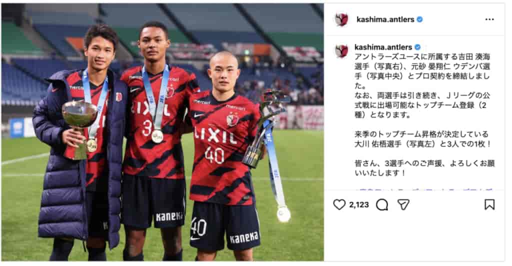 トップ昇格を伝える鹿島アントラーズのインスタグラムより / 一番右が吉田湊海選手