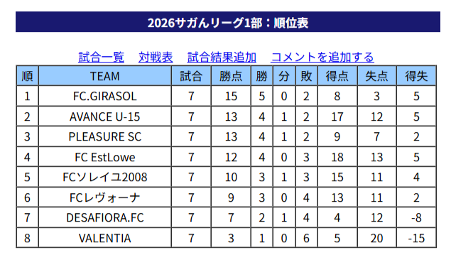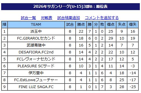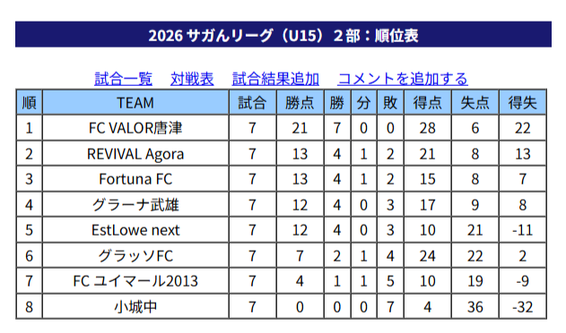 1位:FC VALOR唐津、2位:REVIVAL Agora、3位:Fortuna FC、4位:グラーナ武雄、5位:EstLowe next、6位:グラッソFC、7位:FC ユイマール2013、8位:小城中