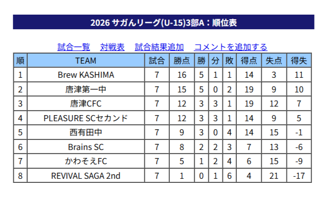 1位:Brew KASHIMA、2位:唐津第一中、3位:唐津CFC、4位:PLEASURE SCセカンド、5位:西有田中、6位:Brains SC、7位:かわそえFC、8位:REVIVAL SAGA 2nd