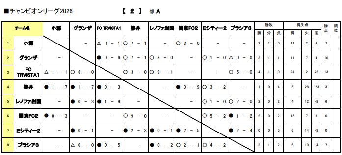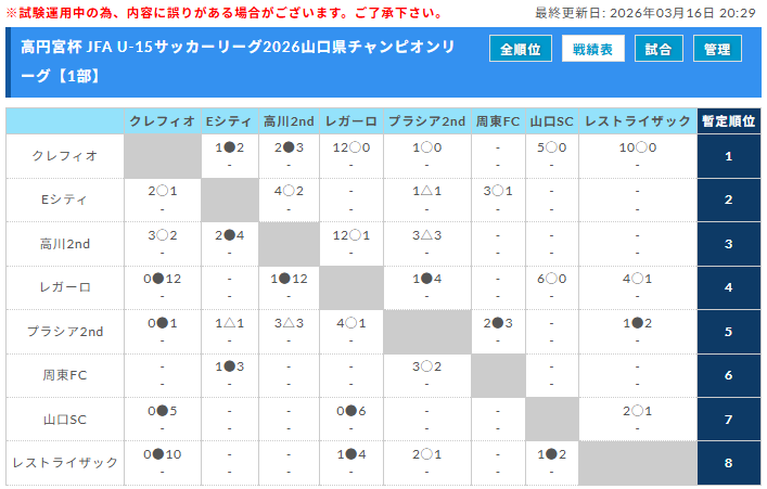クレフィオ、高川2nd、Eシティ、周東FC、山口SC、レガーロ、プラシア2nd、レストライザック