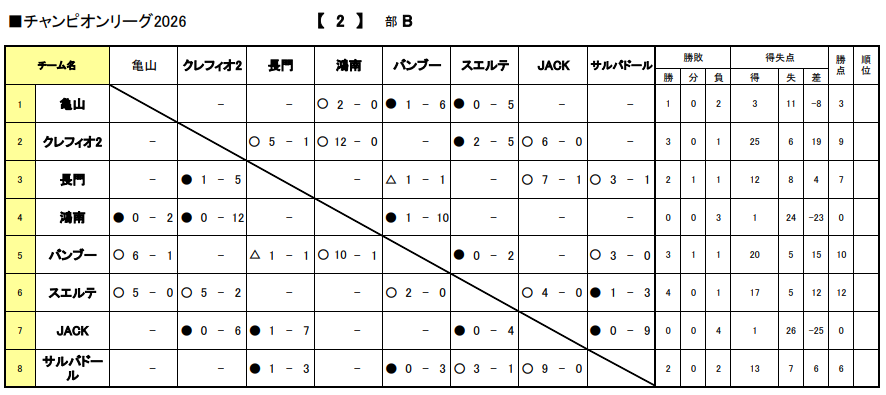 ②2部は前期終了後、A・Bブロック各6位~8位(下位3チーム)チームは自動降格し、3部リーグ各1位チームは自動昇格する。