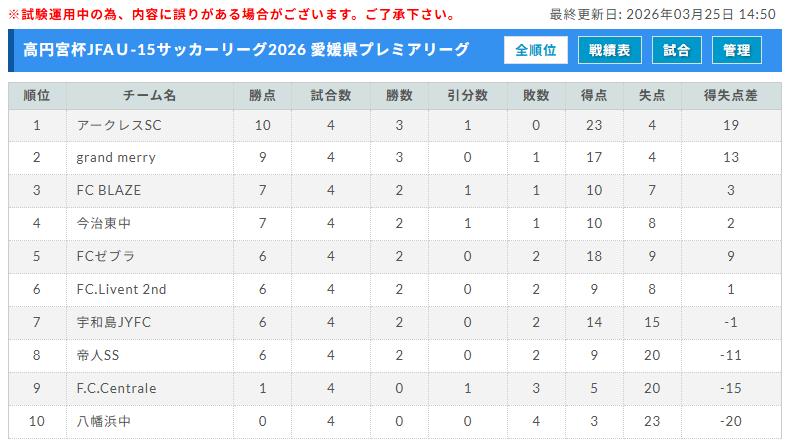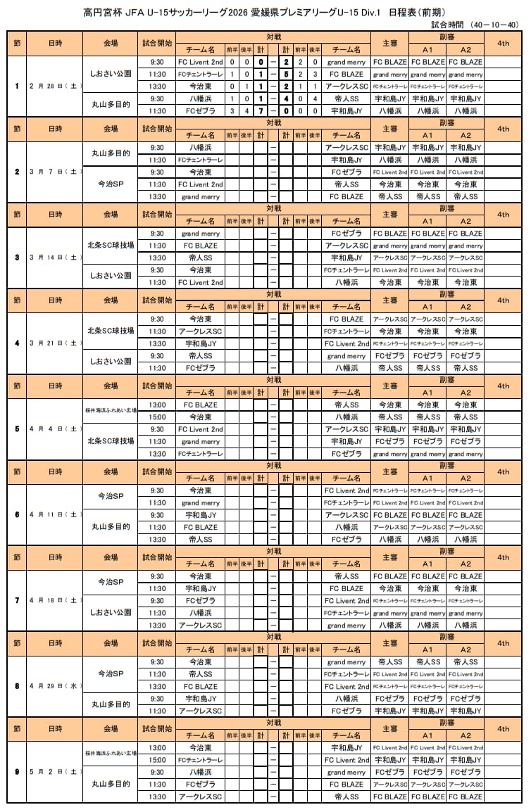 2026年度 高円宮杯JFAU-15サッカーリーグ愛媛県 プレミアリーグ 4/4結果速報!