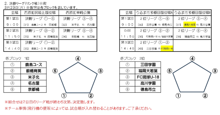 1位リーグ:鹿島ユース、前橋育英、米子北、名古屋、京都橘