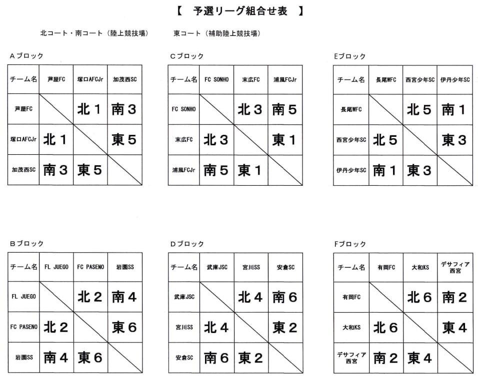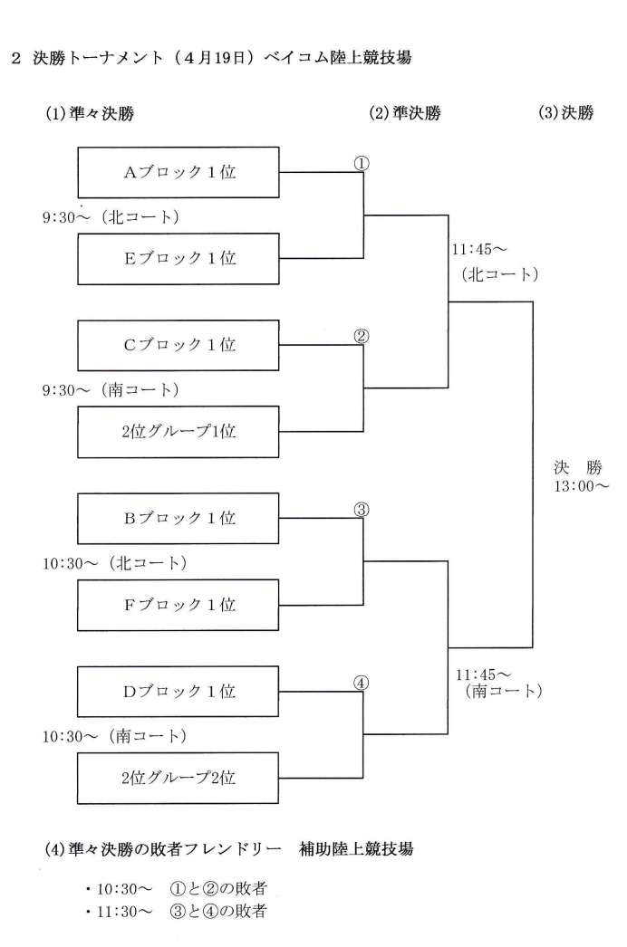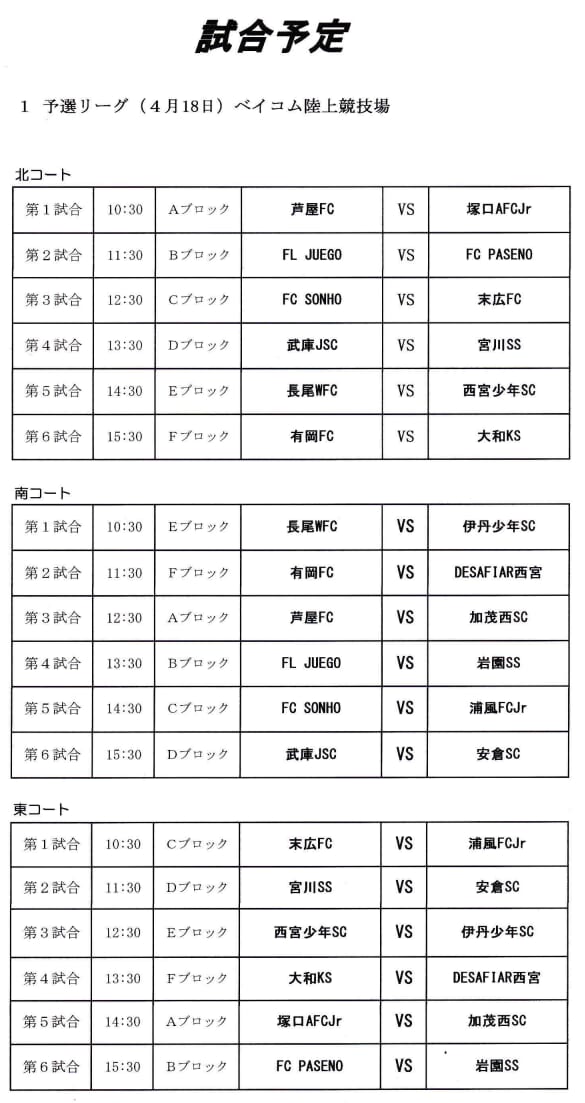 予選リーグ 組合せ 4/18 各ブロック1位+2位の上位2チームが決勝トーナメント進出