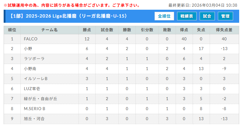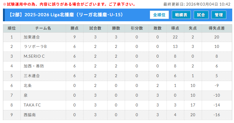 2部リーグ 3/1更新 次戦3/7.8 加東連合が開幕3連勝!ラソボーラB、M.SERIO C、加西・善防、三木連合が開幕2連勝