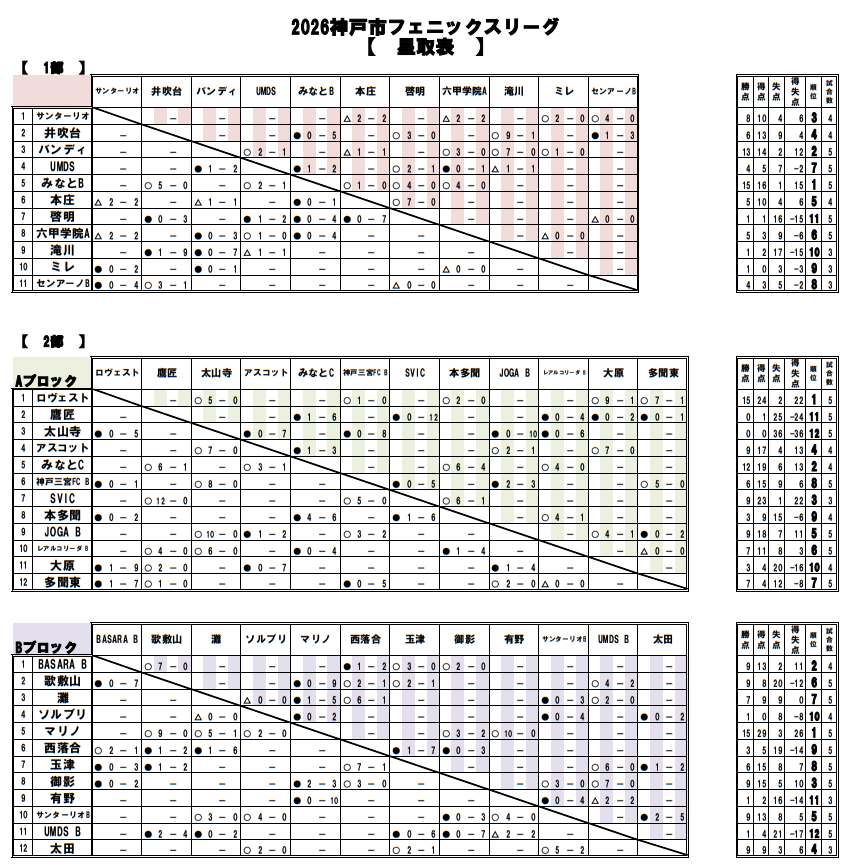 大変遅くなりましたが、記事内に掲載し、リーグ戦表を作成いたしました。
