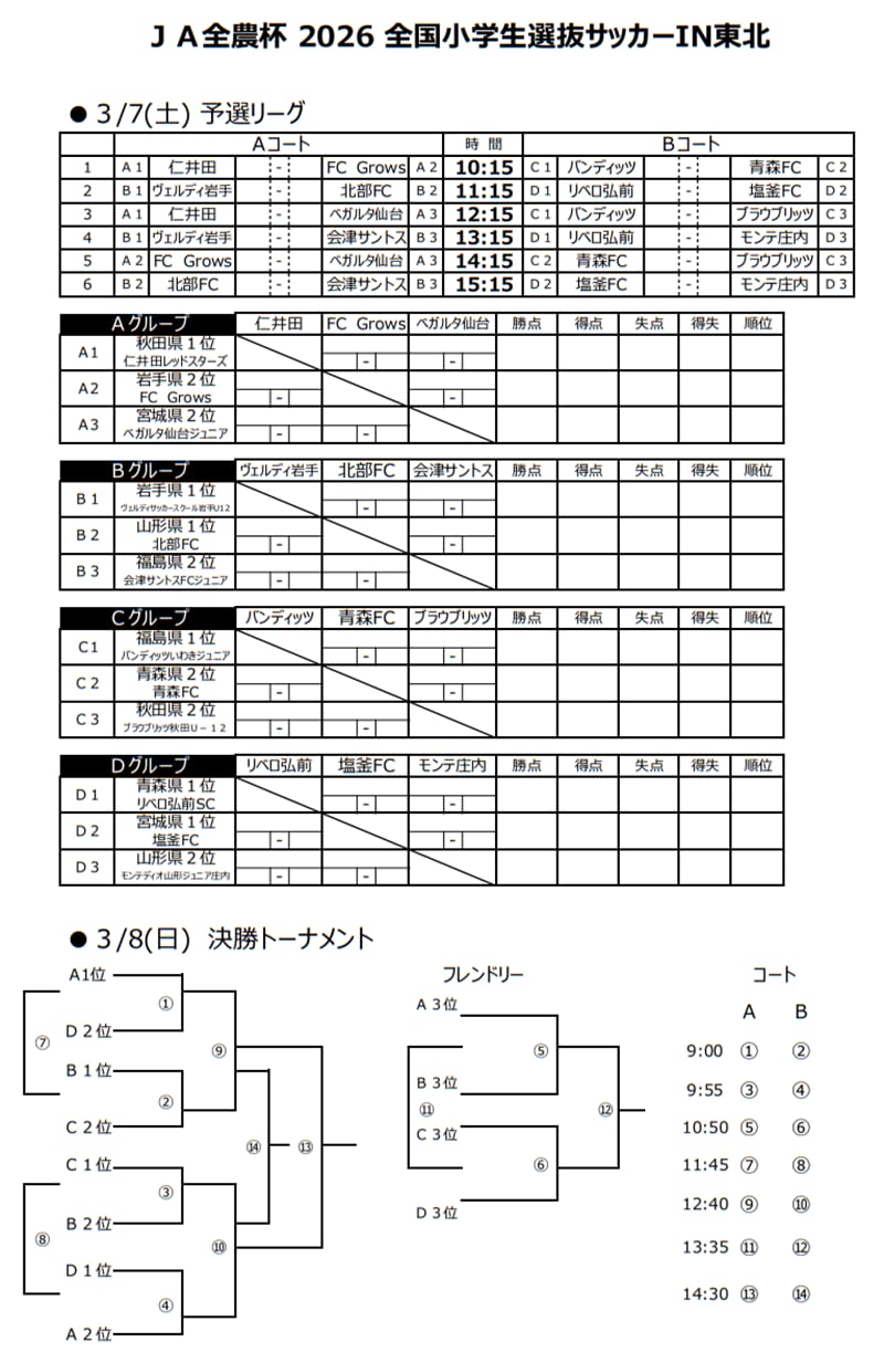 Aグループ:仁井田レッドスターズ、FC Grows、ベガルタ仙台ジュニア