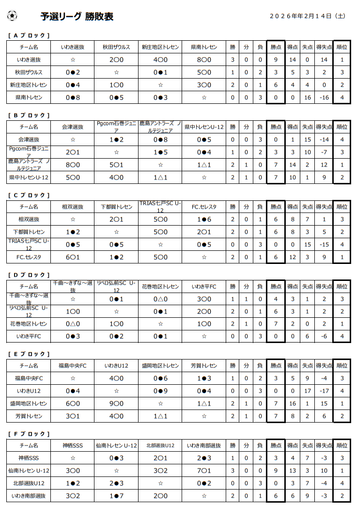 Fブロック:神栖SSS、仙南トレセンU-12、北部選抜U12、いわき南部選抜