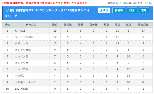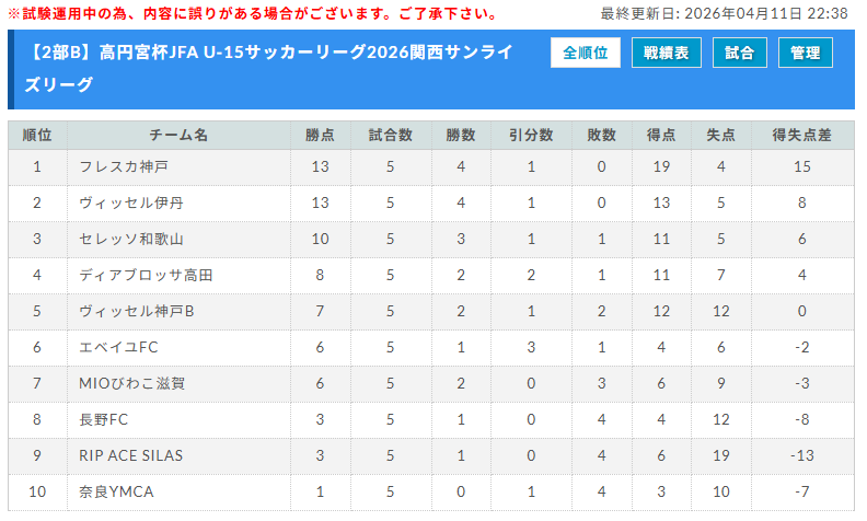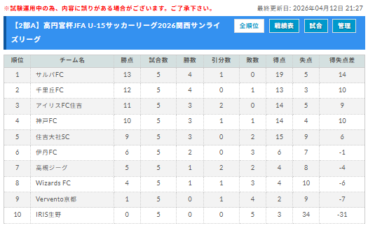 高円宮杯JFA U-15サッカーリーグ2026関西サンライズリーグ 第5節4/12結果更新!第6節4/18.19