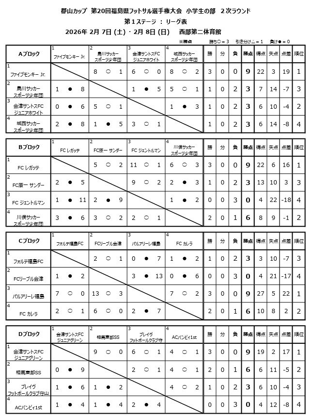 Aブロック:ファイブモンキーJr、鳥川SSS、会津サントスFCジュニアホワイト、城西SSS