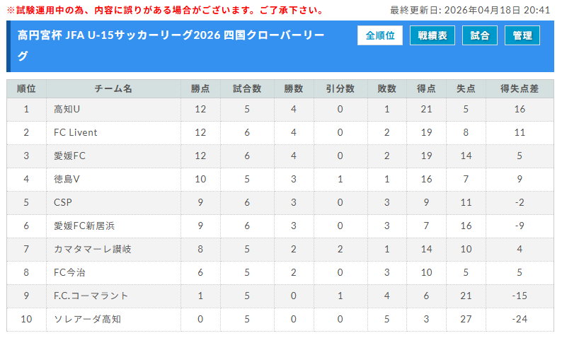 高円宮杯JFA U-15サッカーリーグ2025 四国クローバーリーグ 2026参入はCSPサッカーアカデミー・FCソレアーダ高知!優勝はFC今治、高円宮杯全国大会出場決定!四国大会出場4チームも決定!