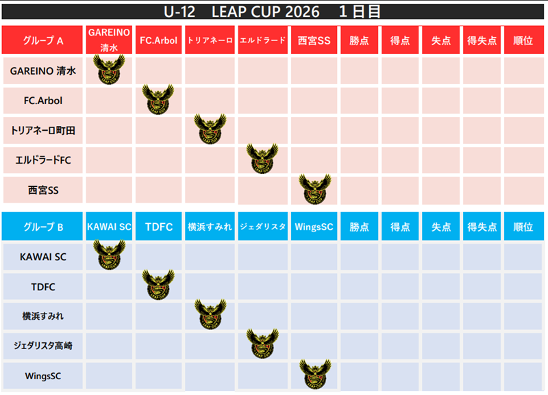 趣旨県外の強豪チームと強度の高い試合を経験することで、静岡県の少年サッカーの発展と育成を目指すとともに相互の親睦を深めることを目的とする。主催 :KSK Management協賛:DalPonte場所:御殿場時之栖 裾野グラウンド D宿泊場所:時之栖スポーツセンター下和田キャンパス参加チーム 全10チーム:西宮SS(兵庫県)横浜すみれSC(神奈川県)TDFC(神奈川県)FC.Arbol(神奈川県)FCトリアネーロ町田(東京都)Wings SC(栃木県)ジェダリスタ高崎(群馬県)エルドラードFC(山梨県)GAREINO清水(静岡県)KAWAI SC(静岡県)
