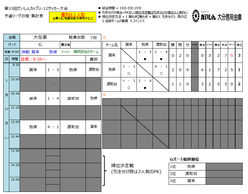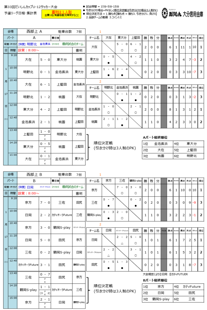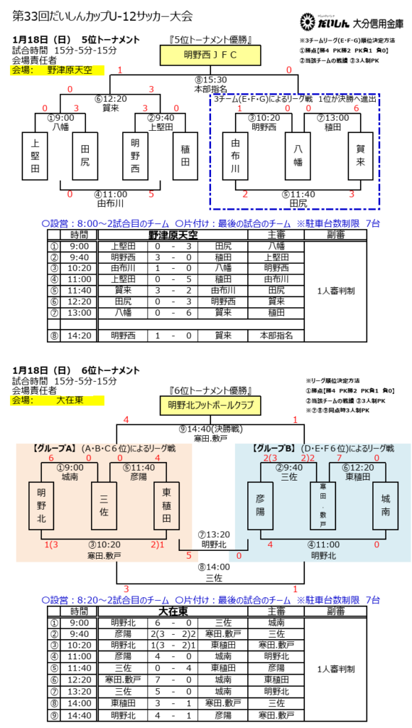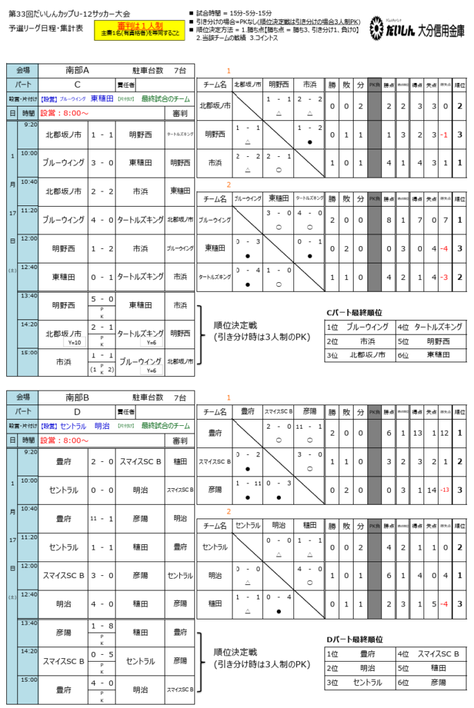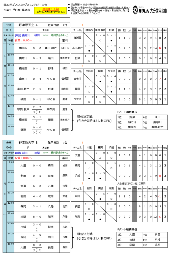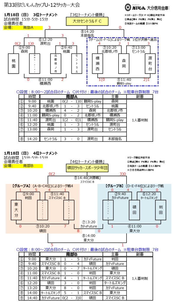 ・予選リーグは1パート3~6チームによるリーグ戦方式とし各パート予選リーグの順位によって1/18の決勝トーナメントへ進みます。