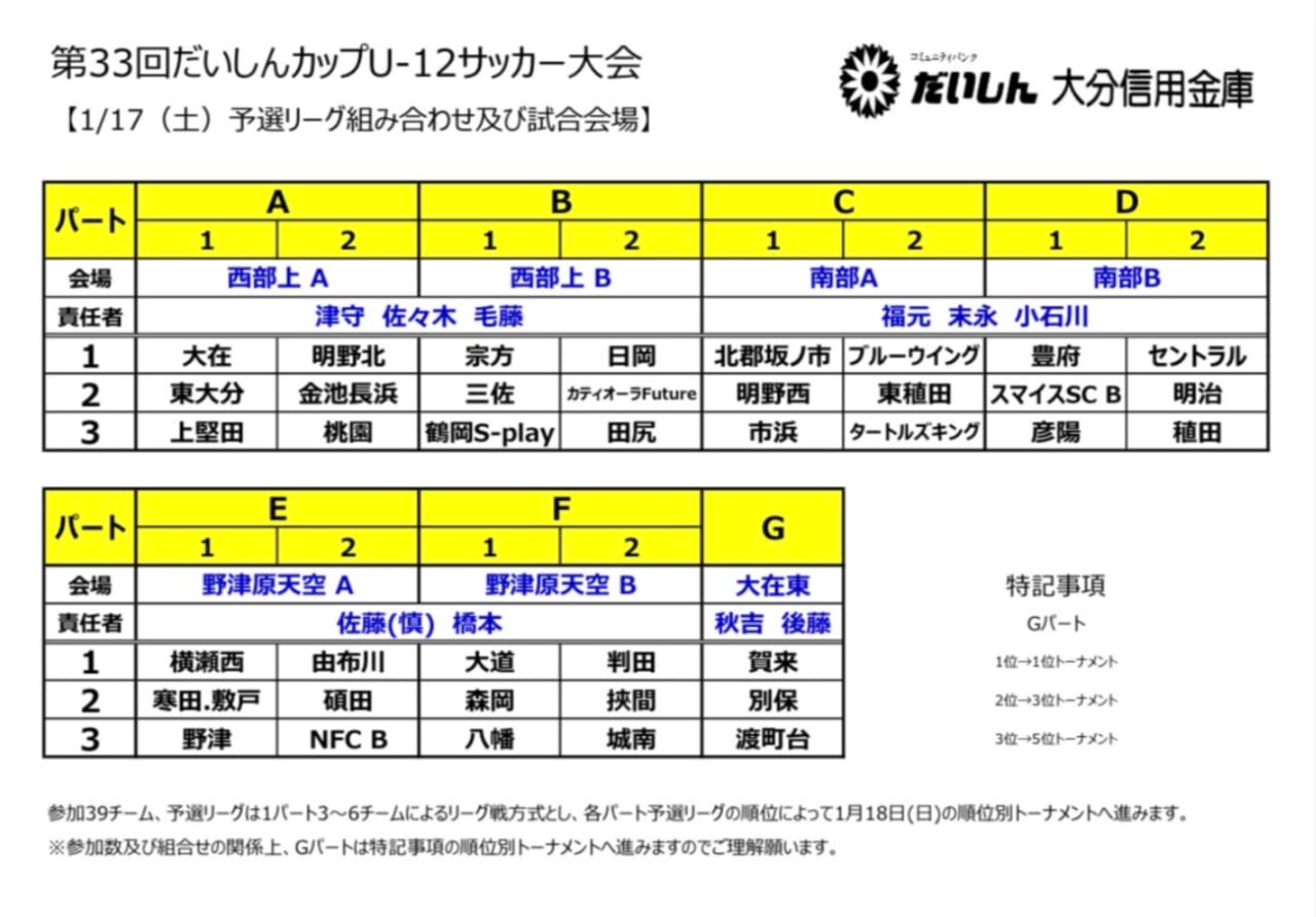 2025年度 第33回だいしんカップU-12サッカー大会(大分) 1/17.18結果速報!組合せ掲載!0件 第33回だいしんカップU-12サッカー大会 目次 ・大会組合せ・結果 ・大会概要 ・予選の結果 ・過去の大会結果 情報提供はこちら ◆この大会、各チームはどう戦う?どう戦った? チームブログ掲示板 予選リーグ組合せ 速報掲示板より情報提供いただきました。ありがとうございます! 大会概要 【日程】 2026年1月17日(土)、18日(日) 【大会概要】 ・参加39チーム ・予選リーグは1パート3~6チームによるリーグ戦方式とし各パート予選リーグの順位によって1/18の決勝トーナメントへ進みます。 その他わかり次第掲載します。 大分県内の地域ごとの最新情報はこちら 大分少年サッカー応援団 過去の大会結果 2023年度 第31回だいしんカップ少年サッカー大会 大分 優勝は弥生SSC! 寄稿者プロフィールJUNIOR SOCCER NEWSWriter【九州・沖縄】担当 KANA3児のママです。4歳の息子君にサッカーをさせようと体験させたら、付添のお姉ちゃんの方がはまり2人仲良く通っています。将来のなでしこに...サッカー初心者です★ライターブログ寄稿者の最近の投稿2026年1月18日熊本2025年度 熊本市協会長杯ジュニアユースサッカー大会 結果情報ありがとうございます!1/17結果速報...2026年1月18日鹿児島中学生2025年度 KFA第33回鹿児島県U-13サッカー大会 県大会 準決勝・決勝1/18結果速報!1/1...2026年1月18日鹿児島中学生2025年度 KFA 第20回九州クラブユース U-13 サッカー大会 鹿児島県予選 予選リーグ1/1...2026年1月18日長崎高校生2025年度 第60回長崎県高校新人体育大会サッカー競技(女子)1/17結果掲載!決勝1/24開催!【九州・沖縄】担当 KANAの記事一覧