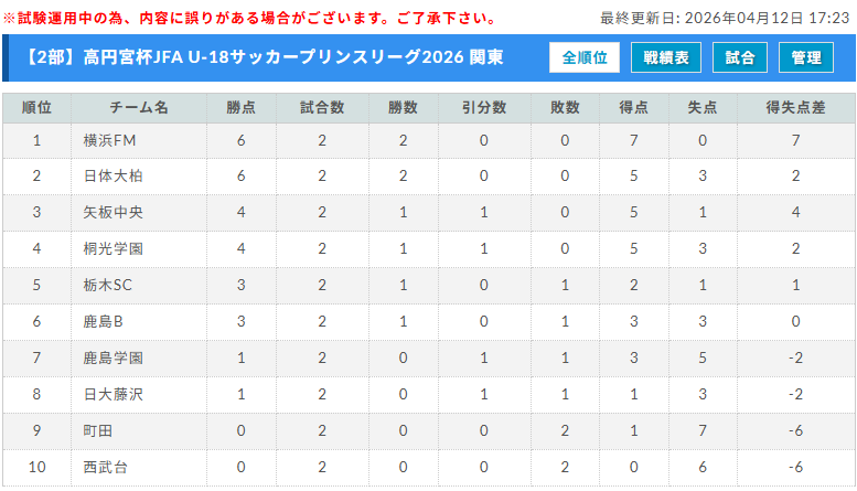 2部リーグ 4/12分まで更新
