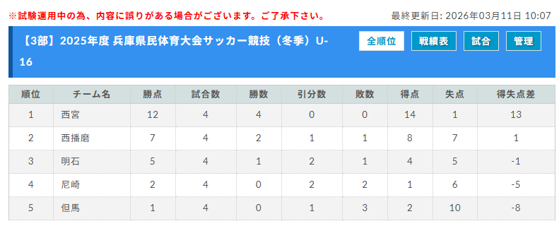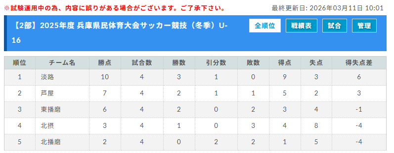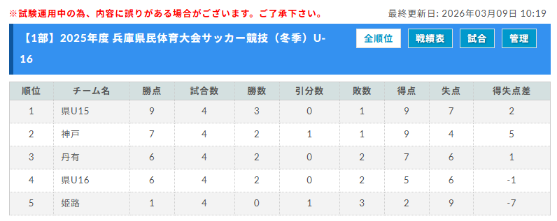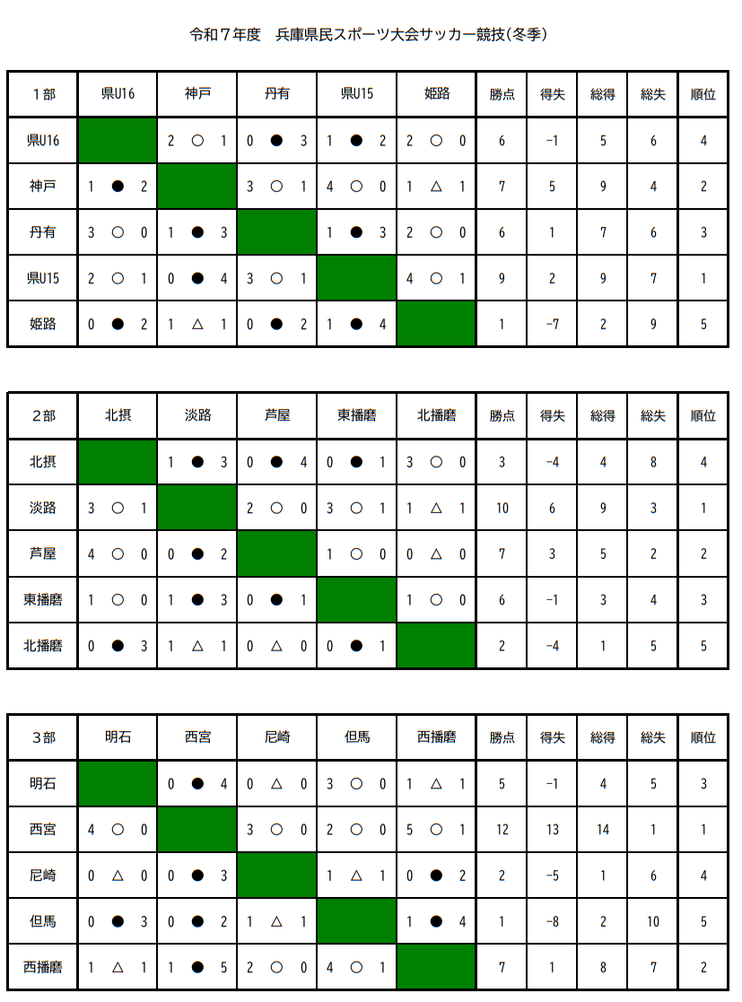 1位:県U15、2位:神戸、3位:丹有、4位:県U16、5位:姫路