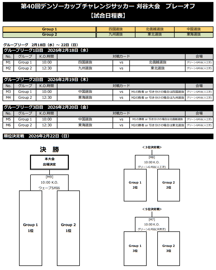 (1) グループリーグ終了時点での勝点(勝利3点、引き分け1点、敗戦0点)の合計が多いチームを上位とし、順位を決定する。