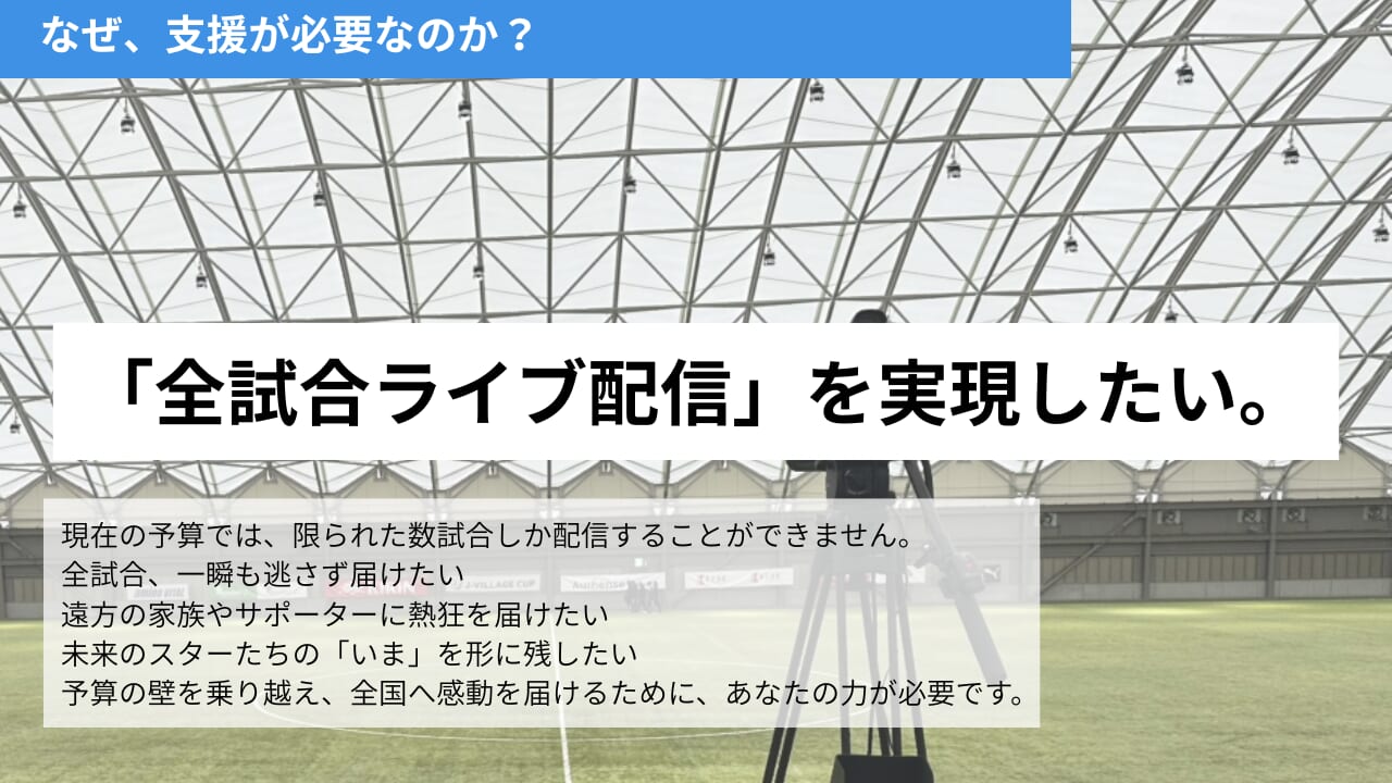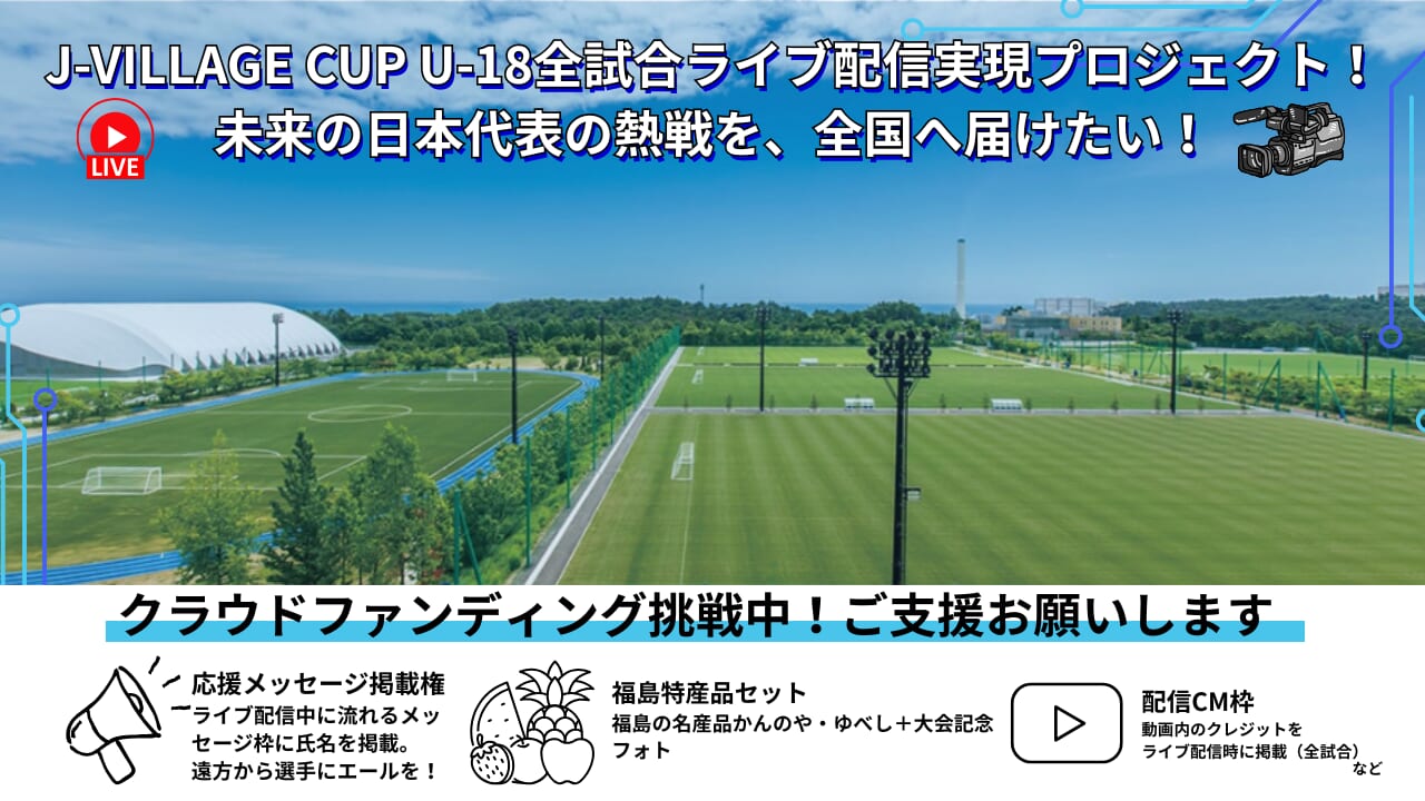 震災という困難を乗り越え、2019年に全面再開を果たしたJヴィレッジは、今や再び全国の若き才能が集まる「聖地」となりました。この場所で繰り広げられる熱戦を、場所の制約なく、一人でも多くの人に届けたい。そんな想いから、現在「全試合ライブ配信」を実現するためのクラウドファンディングが実施されています。