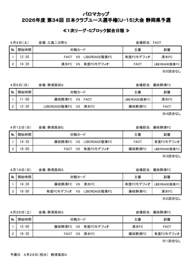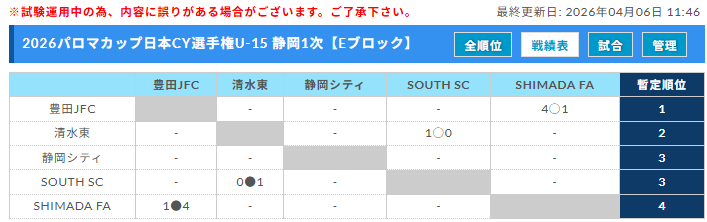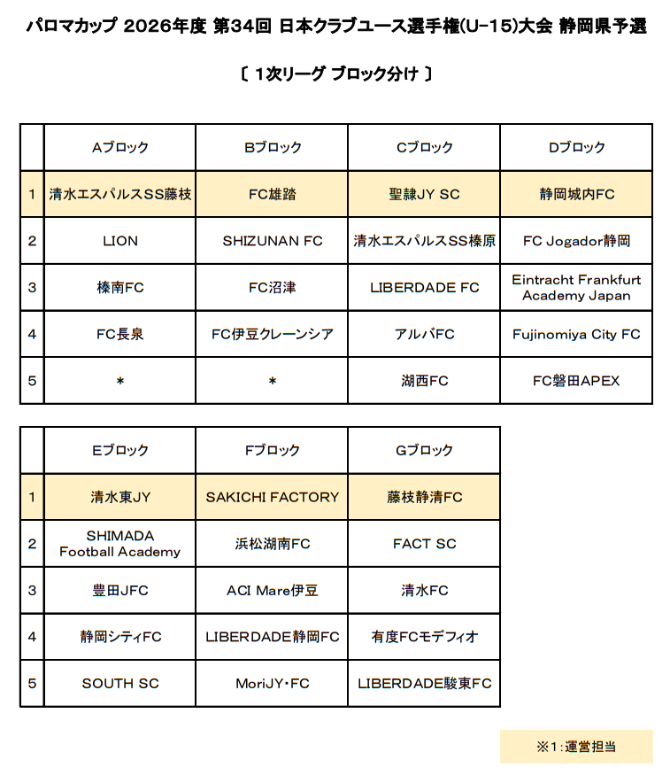 清水東JY、SHIMADA Football Academy、豊田JFC、静岡シティFC、SOUTH SC