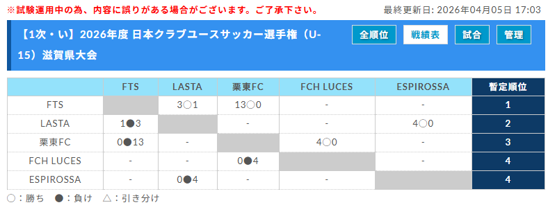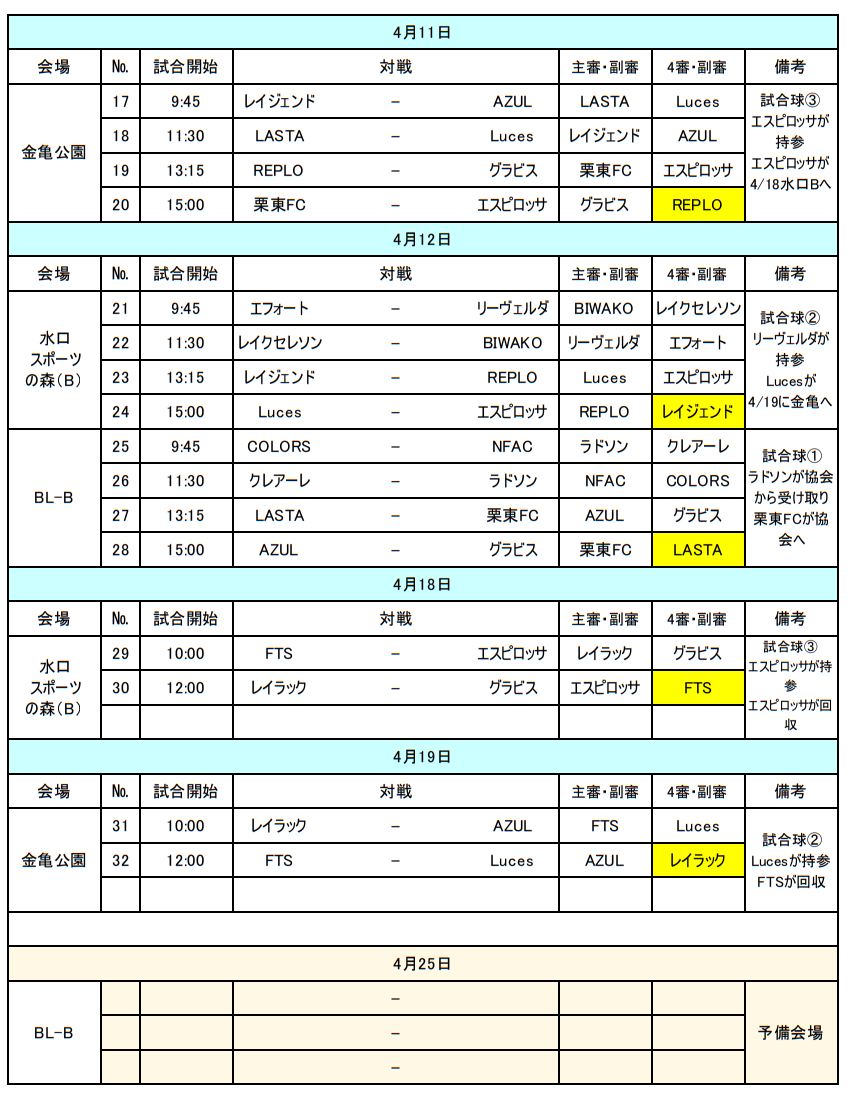 FTS、LASTA、栗東FC、FCH LUCES、ESPIROSSA彦根