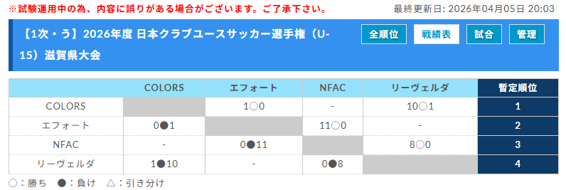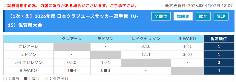 決定の順序は、 ①勝ち点 ②得失点 ③総得点 ④総失点 とする。 ※4/11更新