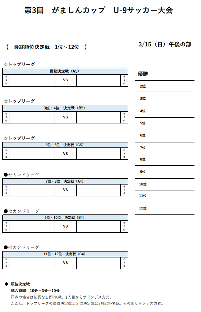 順位決定戦は同点の場合延長なし即PK戦、1人目からサドンデス方式。