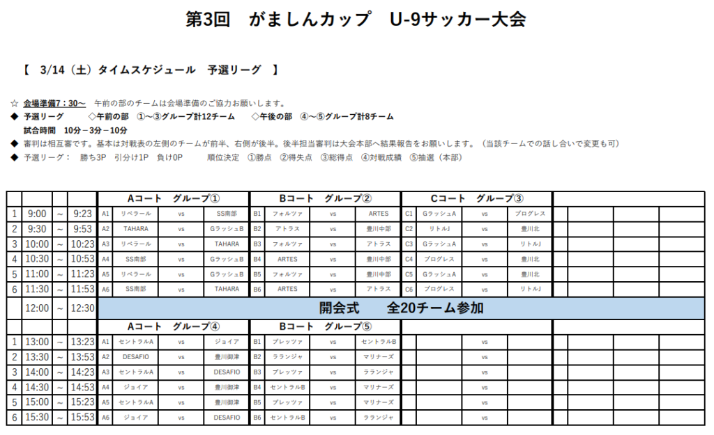 ◇午前の部 ①~③グループ計12チーム ◇午後の部 ④~⑤グループ計8チーム