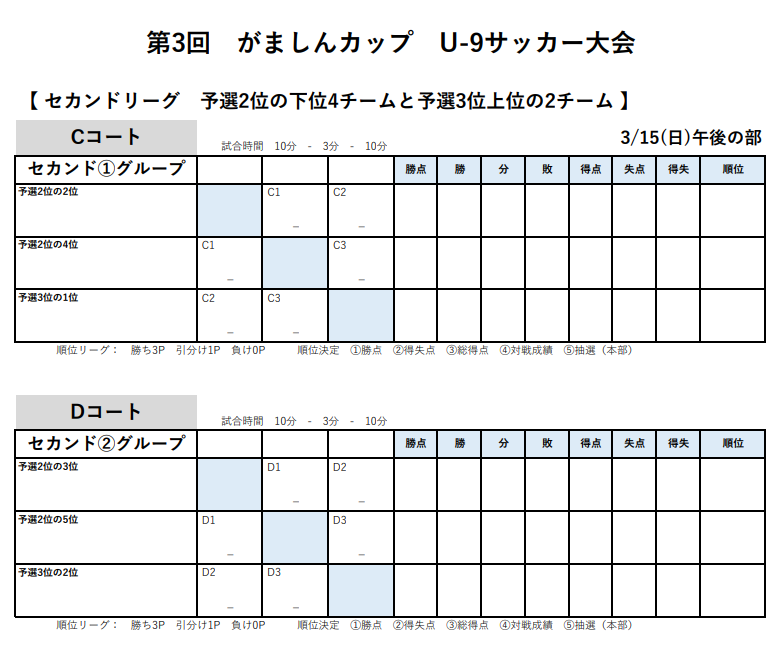 セカンドリーグ:予選2位下位の4チームと3位上位2チーム ⇒順位決定戦 試合時間:10分-3分-10分