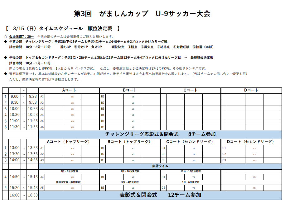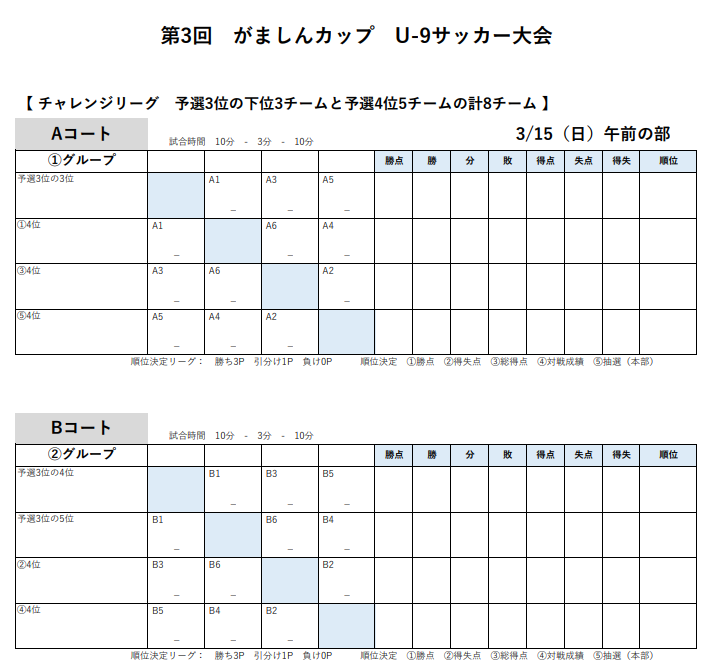 午前の部 チャレンジリーグ:予選3位下位の3チームと予選4位5チームの計8チーム 試合時間:10分-3分-10分