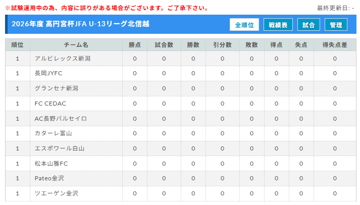 高円宮杯JFA U-13サッカーリーグ2026 第13回北信越リーグ リーグ表掲載!5/2~10/18開催!