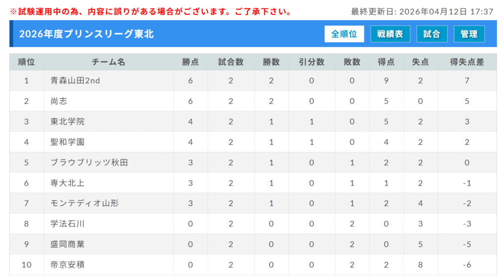 東北プリンスリーグ 4/11,12結果更新!次回4/18