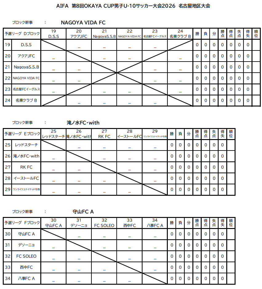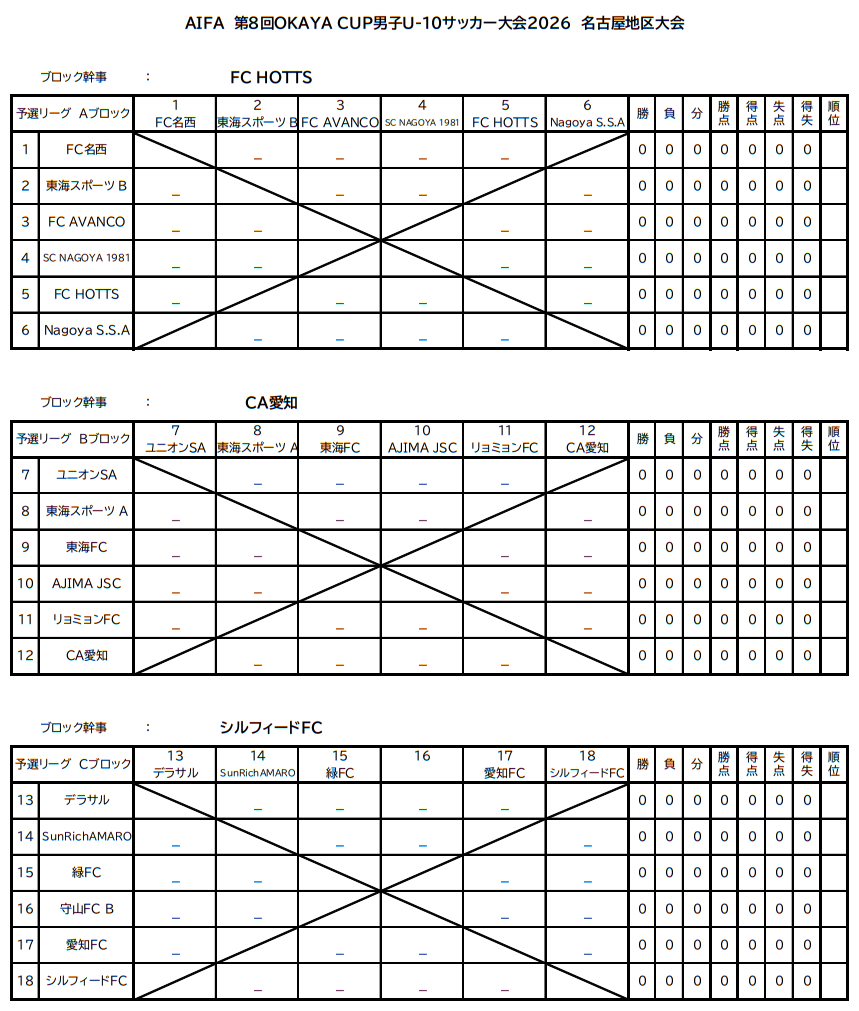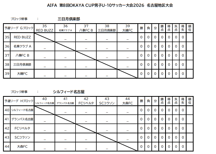 ※本大会の各トーナメントの1位のチームが AIFA 第 8 回 OKAYA CUP U-10 サッカー大会愛知県大会に参加することができる。