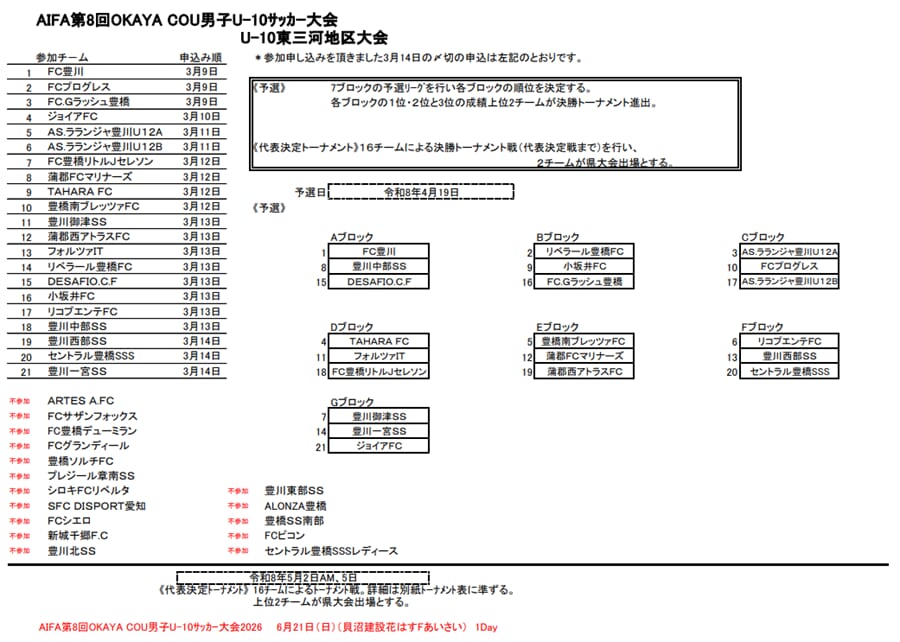 2026年度 OKAYA CUP/オカヤカップ 愛知県ユースU-10サッカー大会 東三河予選 組み合わせ掲載!情報提供ありがとうございます!予選リーグ 4/19開催