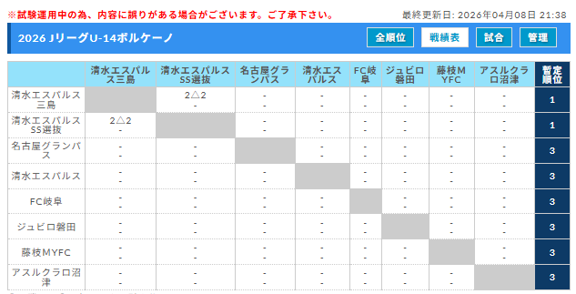 2026年度 Jリーグ U-14 ボルケーノリーグ(東海)組み合わせ・3/29結果更新!次回4/19開催!