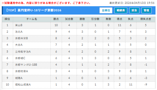 高円宮杯U-18サッカーリーグ2026京都 TOP・2部 4/12結果掲載!次節4/18.19 4部組合せ情報募集