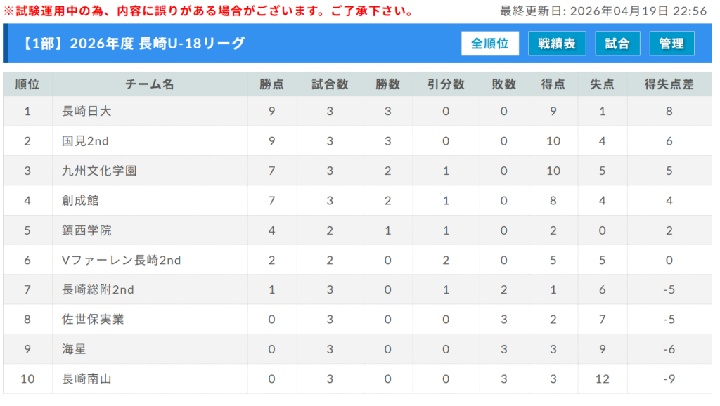 創成館、国見2nd、長崎日大、鎮西学院、九州文化学園、Vファーレン長崎2nd、長崎南山、海星、佐世保実業、長崎総附2nd