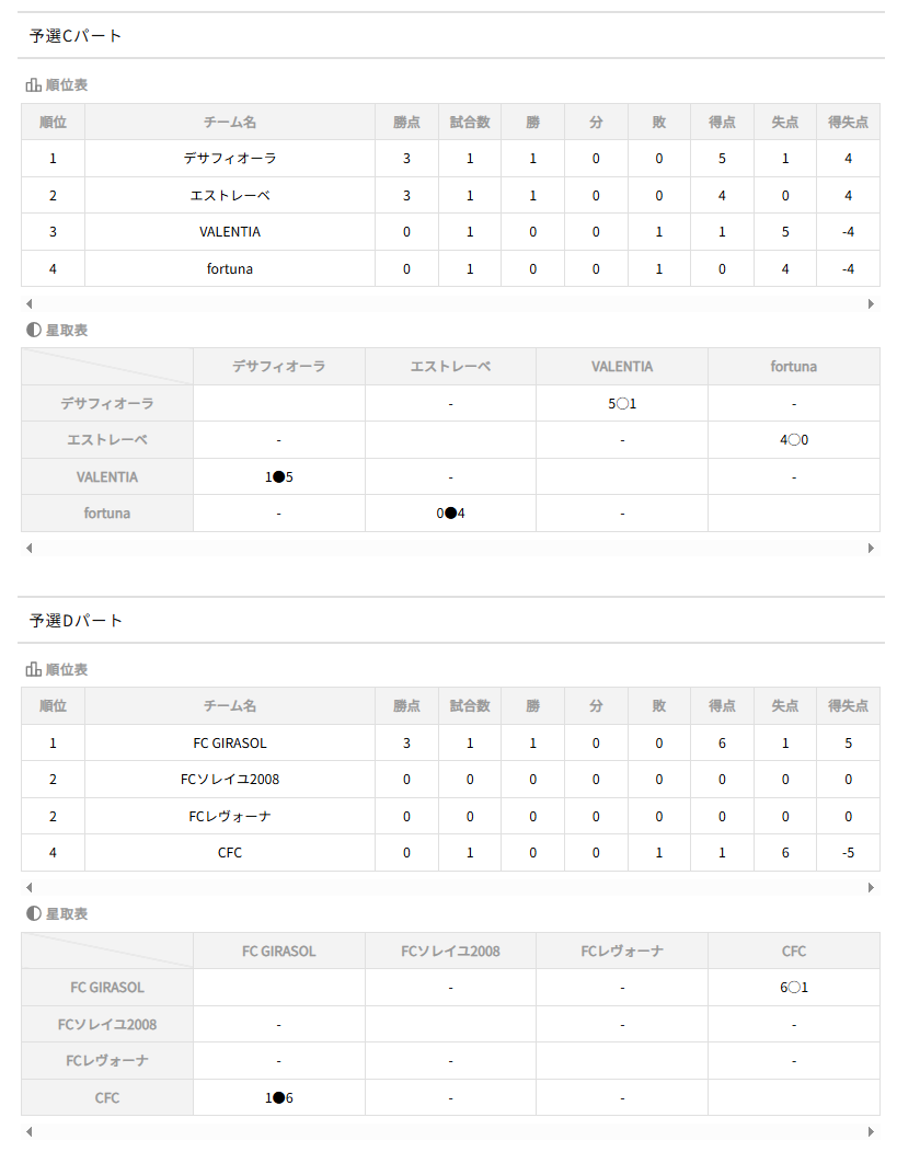 ➀勝点(勝3、分1、 負0)②得失点差③総得点④当該チームの対戦結果⑤抽選とする。