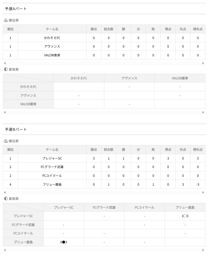・順位決定方法予選リーグにおいては勝敗が決しない場合は引き分けとする。順位の算出方法は、
