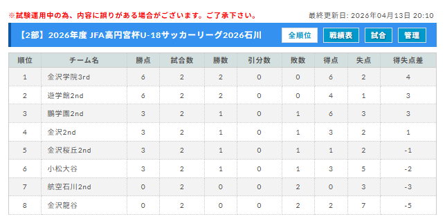 金沢桜丘、ツエーゲン金沢2nd、遊学館、日本航空石川、金沢学院2nd、金沢、金沢市工、星稜2nd